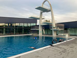 - Das Wasser im Sprungbecken ist tatsächlich ziemlich frisch, was an einem heißen Sommertag und bei entsprechender Bewegung kein größeres Problem darstellt. Wenn jedoch jemand eine Apnoesession inklusive längerer Atempausen machen möchte und ohnehin einen dünnen Neoprenanzug besitzt, könnte man diesen auf jeden Fall mal in die Trainingstasche packen.